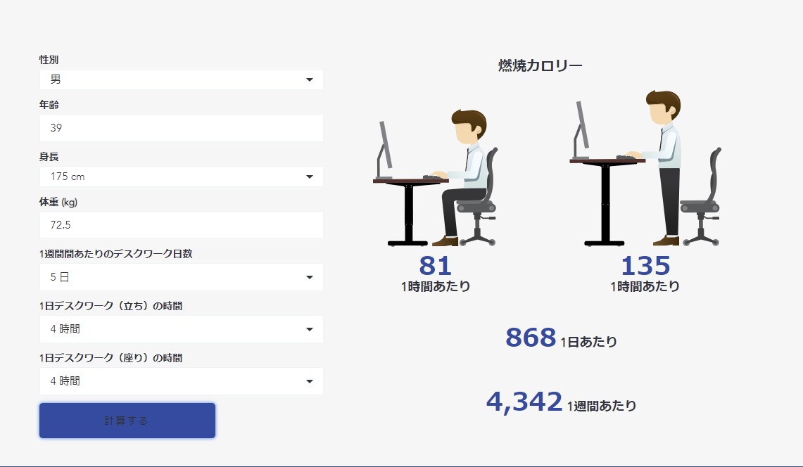FlexiSpotのホームページでは、「座り姿勢」と「立ち姿勢」での消費カロリーの差をチェックすることができます。